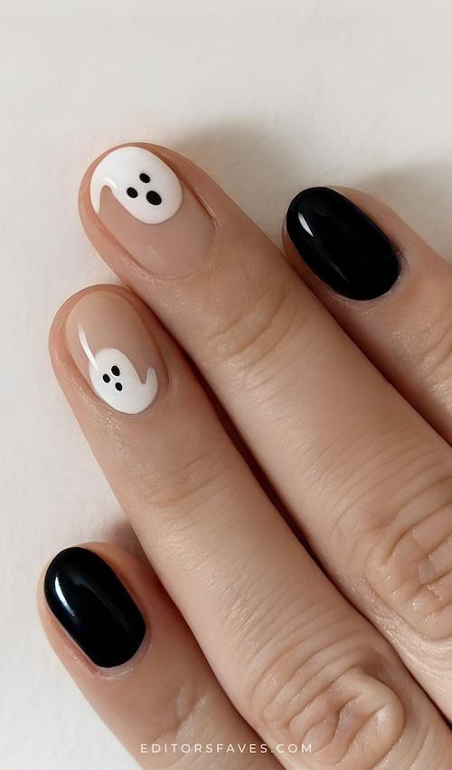 Any great Halloween nail polish kit starts with black nail polish. Mix it up with a light pink for an unexpected twist,and top it with a cute ghost nail sticker!