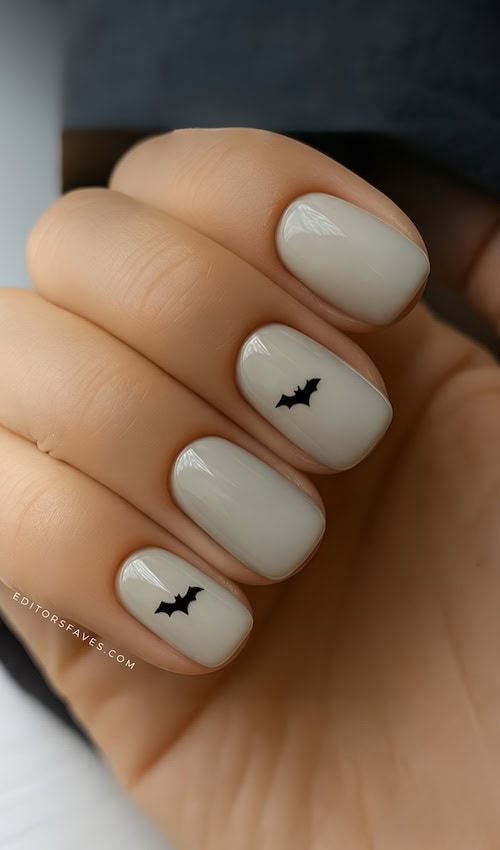 Tiny bats on light grey or taupe background make for a haunting, stunning nail design. Get the bat nail sticker here and then paint over the nail with a clear polish to set.