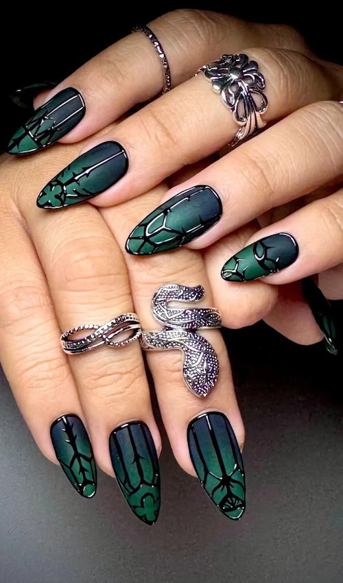 If your October style is less pumpkin spice and more “dark enchantress,” then check out this Halloween nail idea! These green ombré nails are a perfect mix of gothic cathedral windows and venomous forest fairy.