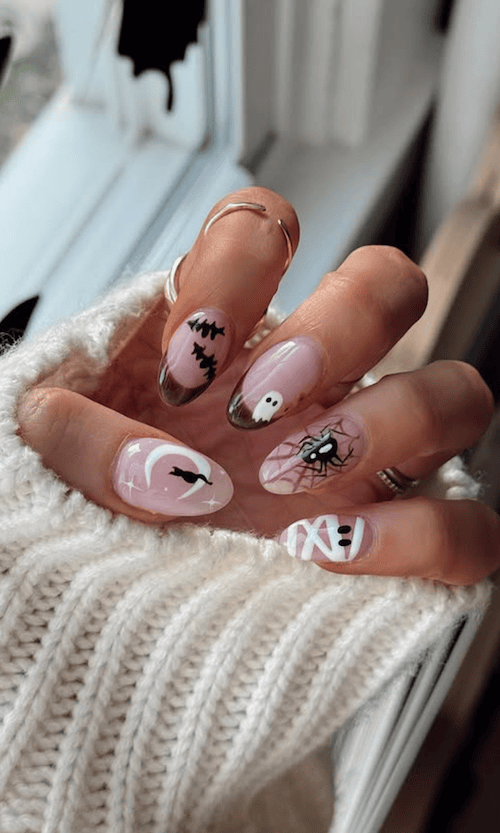 Can’t decide on one Halloween nail design? Draw all of them at once! Black cats, ghosts, spiders, moons, mummies, scars, bring it on!