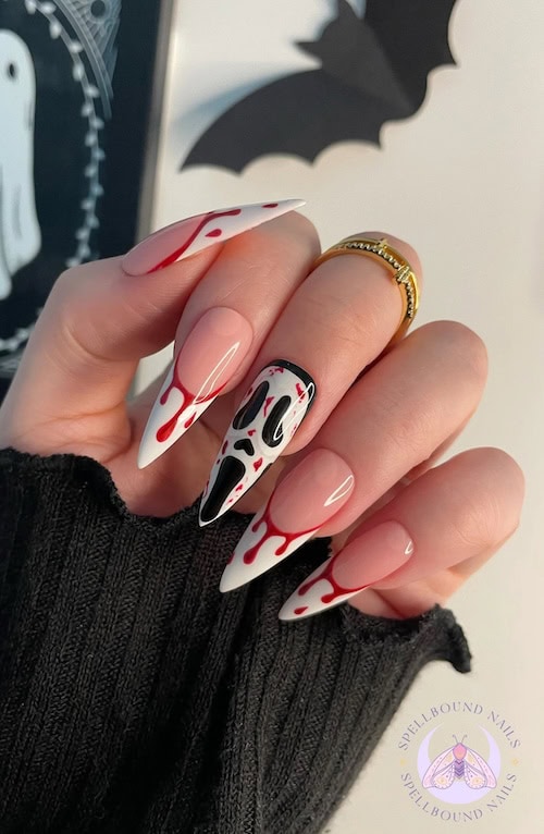 Ok, these Scream nails from Spellbound are amazing! If you are going for a horror-movie inspired nail set this year, Scream is a classic pick. What’s more, you can buy this complete set as press-ons! Shop: