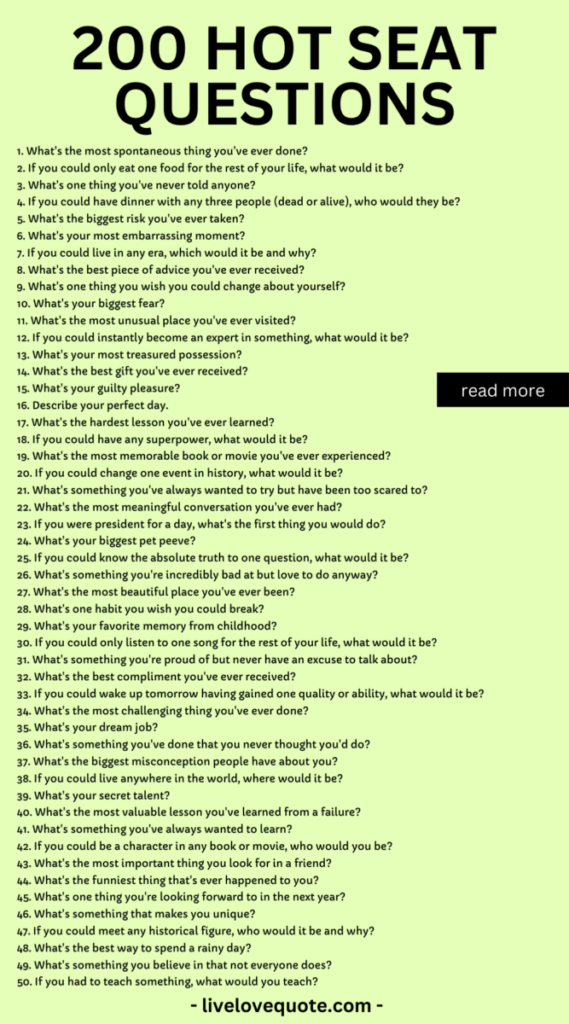 Hot seat questions are some of my favorite ways to spark meaningful and fun conversations. They’re perfect for breaking the ice, getting to know someone new, or even discovering something surprising about an old friend. I love how they can turn a casual chat into a memorable moment.