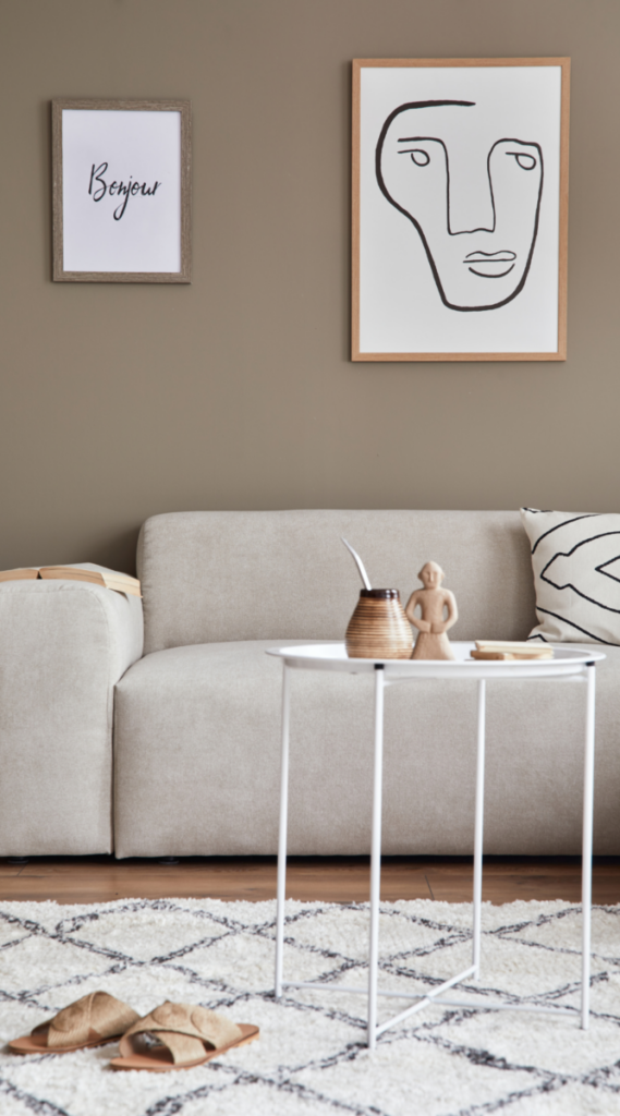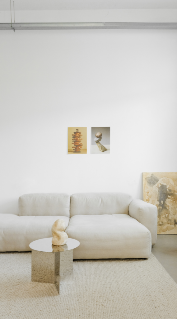 I’m obsessed with how simple yet stunning this space feels! The beige sofa and the abstract art on the wall create such a clean, cozy vibe. That little woven vase on the white table is such a cute detail, it’s minimal but makes the room feel alive and personal.