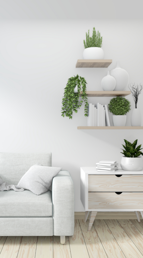 This setup is everything I adore about minimal decor, clean lines, soft textures, and just the right pop of greenery. The floating shelves with plants and white vases make the space feel so fresh and vibrant. It’s such a happy little corner that makes me smile just looking at it!