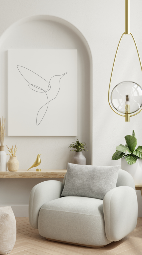 This little corner feels so elegant yet welcoming, I’m loving the soft curves of the chair paired with the gold accents. The hummingbird artwork adds a subtle, artistic flair without overpowering the space. It’s the kind of cozy yet stylish spot I’d love to have for my morning coffee.