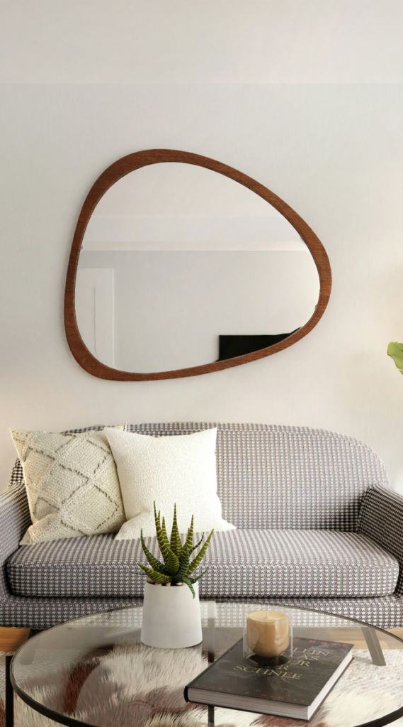 This houndstooth sofa is giving me all the vintage feels, and I’m here for it! The asymmetrical wooden mirror above adds such a unique touch, and the cozy little plant makes the space feel lived-in. It’s a perfect mix of retro and contemporary that feels effortlessly stylish.