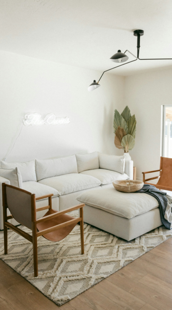 I love how open and inviting this room feels with its soft white sectional and natural accents. The layered textures, like the patterned rug and leather chair, give it just the right amount of depth. The neon wall art adds a playful, personal touch that makes the space feel so unique.