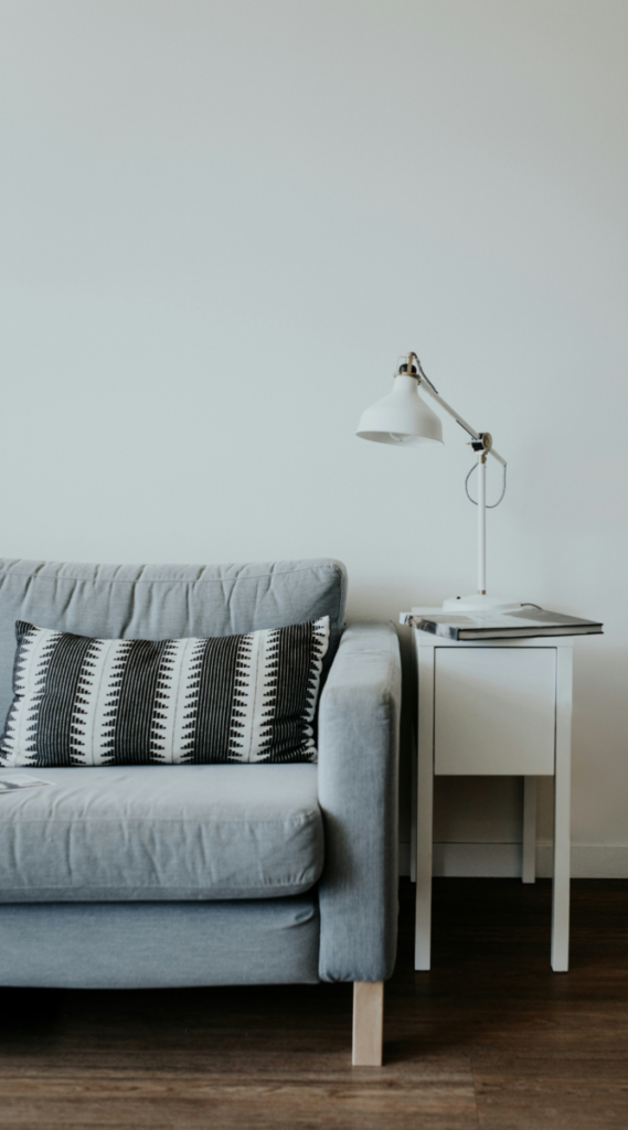 This setup proves that minimal can still be cozy. The soft gray sofa paired with the geometric black-and-white pillow feels clean and modern, while the compact white side table adds just the right functionality. It’s a no-fuss, comfortable corner I could see myself relaxing in every day.