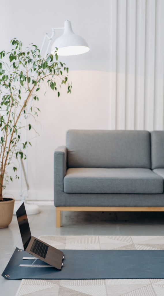 This gray sofa paired with the light wood frame gives such a polished and functional look. I love the soft lighting from the oversized lamp, it makes the space feel warm and inviting, even for a quick work session. The little details, like the cozy rug and greenery, tie everything together perfectly.