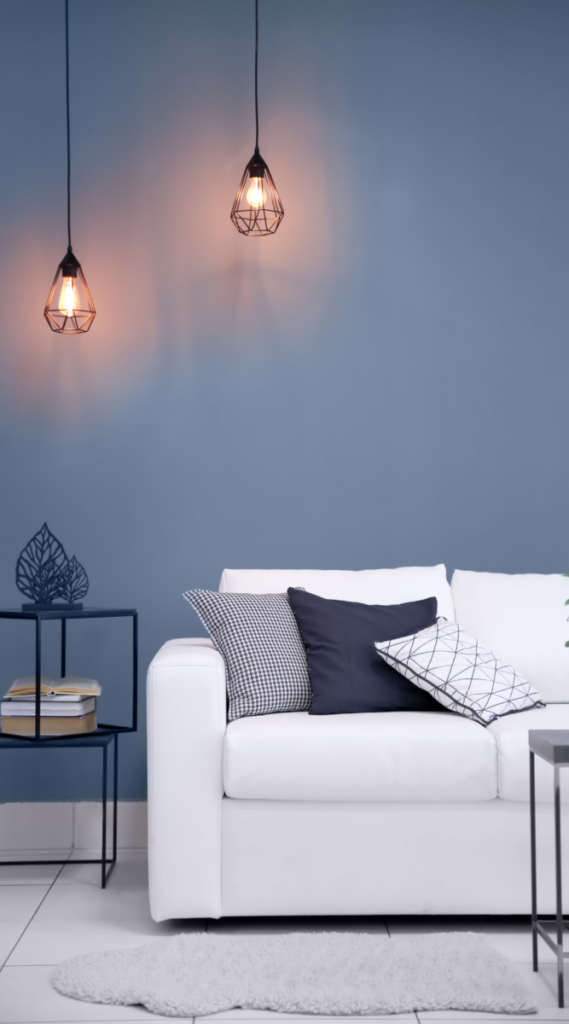 This white sofa against the deep blue wall is such a striking combination, I’m loving how bold yet cozy it feels. The pendant lights add the perfect glow, and those geometric pillows bring in just the right amount of personality. It’s the kind of space that feels equally calming and energizing.