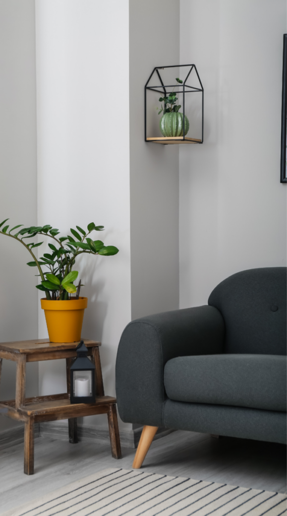 I love how this dark gray sofa pairs with the warm wooden tones of the rustic side table. The pops of greenery bring so much life into the space, especially with the mustard yellow planter adding a fun twist. It’s simple but full of personality, so easy to fall in love with.