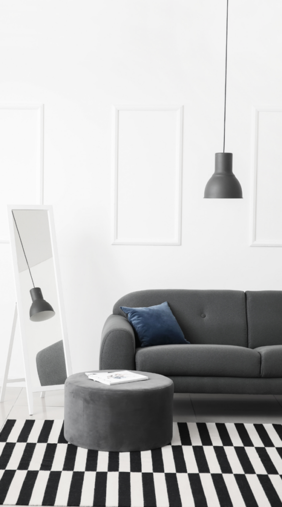 This black-and-white setup is so modern and chic! I love the striped rug and how the blue velvet pillow adds just a pop of color to keep things interesting. The oversized mirror is such a cool touch, it makes the space feel open while doubling as decor.