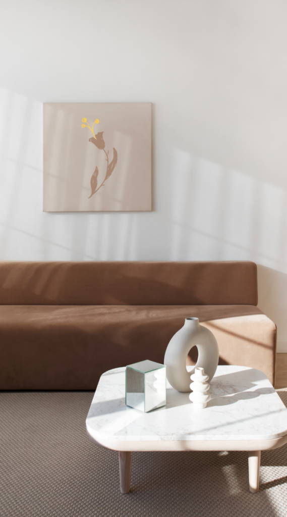 I’m obsessed with how the sunlight just pours into this room, it makes everything feel so warm and peaceful. The brown sofa is the perfect grounding piece, and the marble coffee table adds such an elegant touch. And those little decor pieces? They’re simple but so chic—I need this setup in my life!