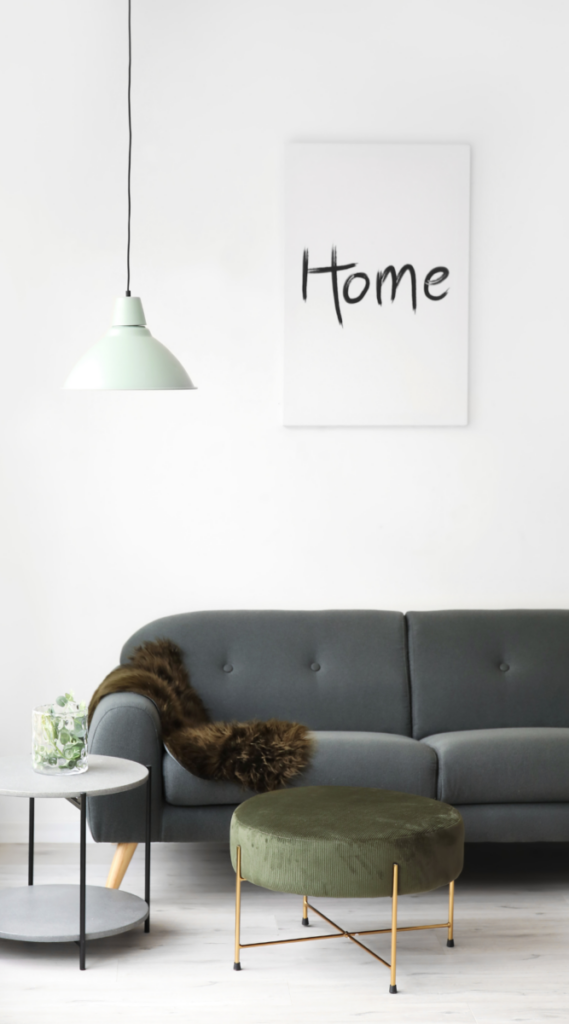 I love how this dark gray sofa pairs with the muted green ottoman, it’s simple but so stylish! The fur throw adds a warm, inviting vibe, and the “Home” artwork above ties everything together perfectly. It’s one of those spaces where you instantly feel comfortable but also inspired by the design.