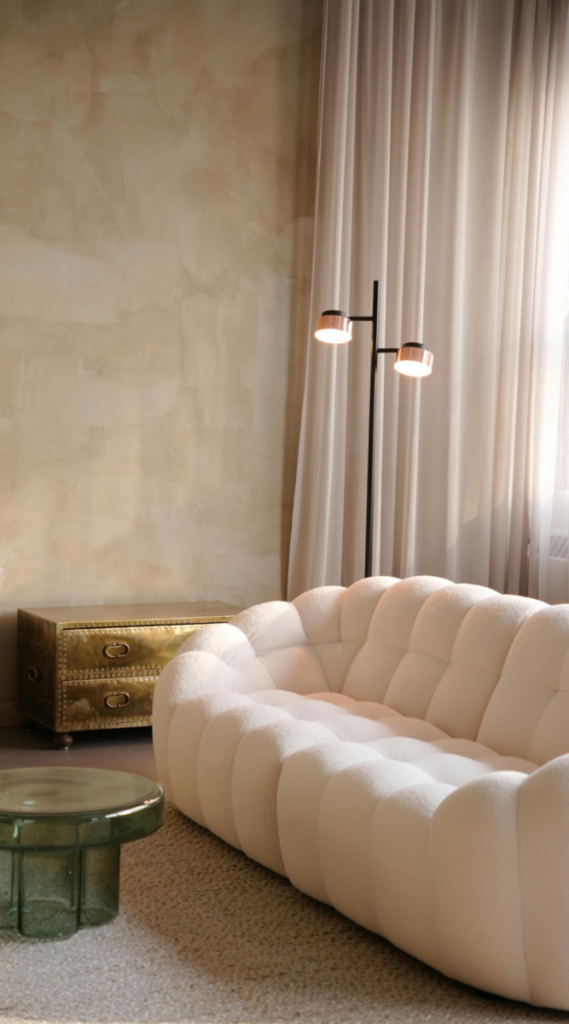 This tufted sofa looks like a cloud, and honestly, I just want to sink right into it! The gold chest and soft lighting give it such a luxe touch, while the green glass table adds a fun, modern twist. It’s minimal but feels so high-end at the same time, I love everything about it.