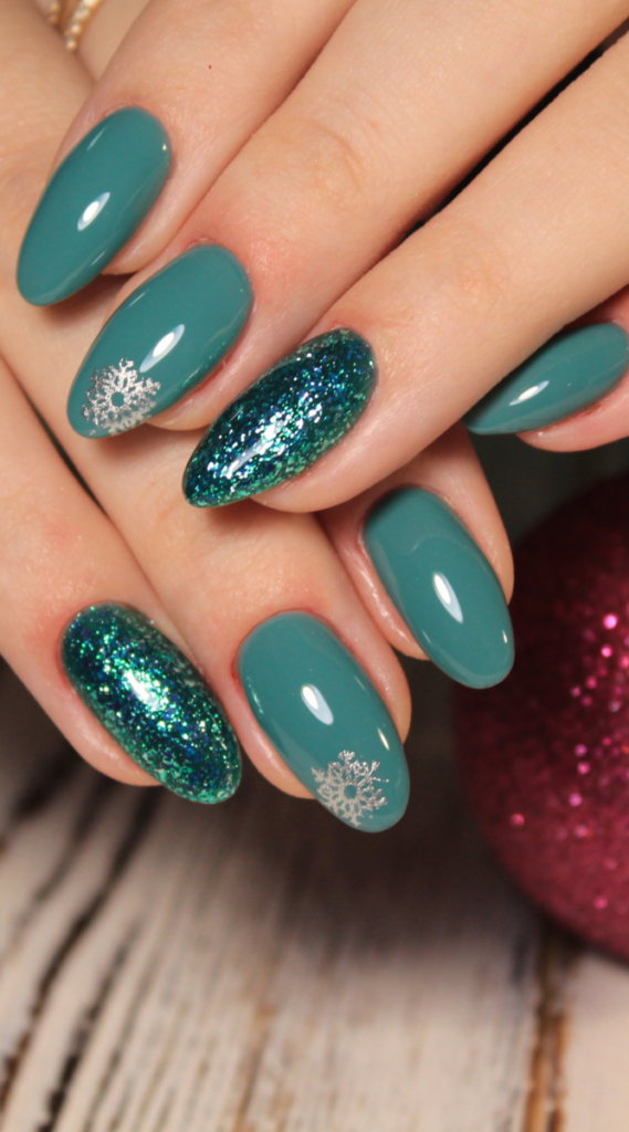 These teal nails keep it fun and simple with a shiny finish and cute silver snowflakes. The green glitter nails add just the right amount of sparkle without being over the top. They’re festive but still low-key enough for a cozy New Year’s night at home or out with friends. Perfect for pairing with anything from jeans to your favorite sweater.