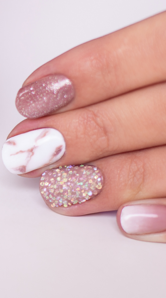 This set has a little bit of everything: soft pink shimmer, marble accents, and holographic glitter. It’s understated but still feels special enough for celebrating. These nails are great for a low-key New Year’s night, whether you’re at home or enjoying a quiet dinner. The neutral tones make them super versatile for any outfit.
