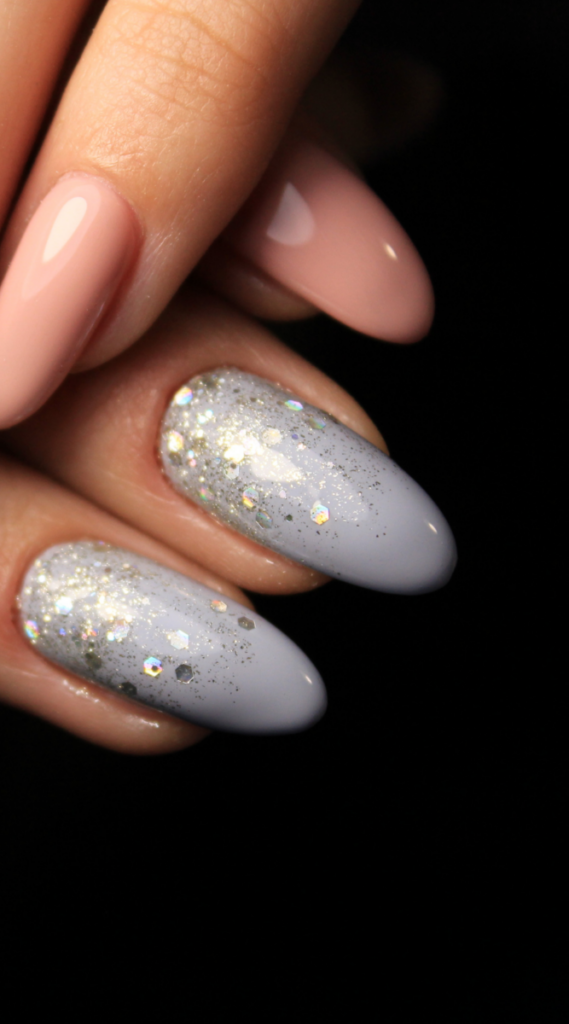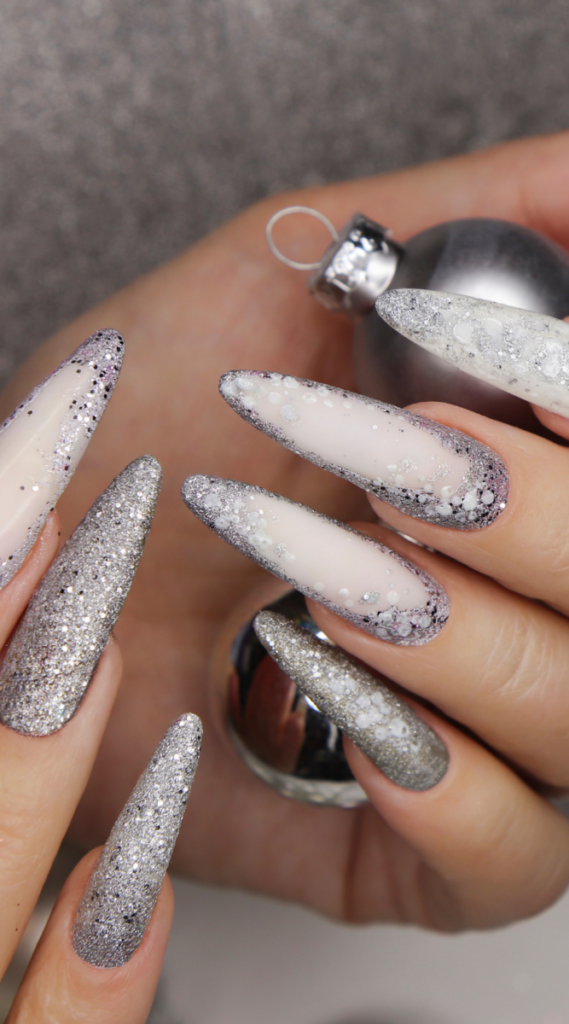 Soft nude and gray nails with a glitter-dipped effect make this manicure feel effortlessly chic. The silver sparkles add just the right amount of shine without being too much. It’s great for anyone who wants a subtle but polished look for New Year’s. These nails work for any outfit and any plan.