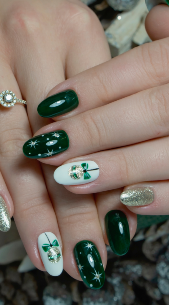 These deep green nails are dressed up with tiny star accents and paired with festive gold glitter and white details. The ornament design on the white accent nail adds a fun holiday vibe. Perfect for keeping things festive but still casual, this look is great for a New Year’s party or a quiet evening with loved ones.