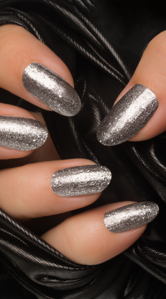 These silver glitter nails are simple, shiny, and perfect for New Year’s. The all-over glitter makes them stand out while still being easy to pair with any outfit. Whether you’re staying in or going out, these nails are a great way to keep things festive without too much effort.