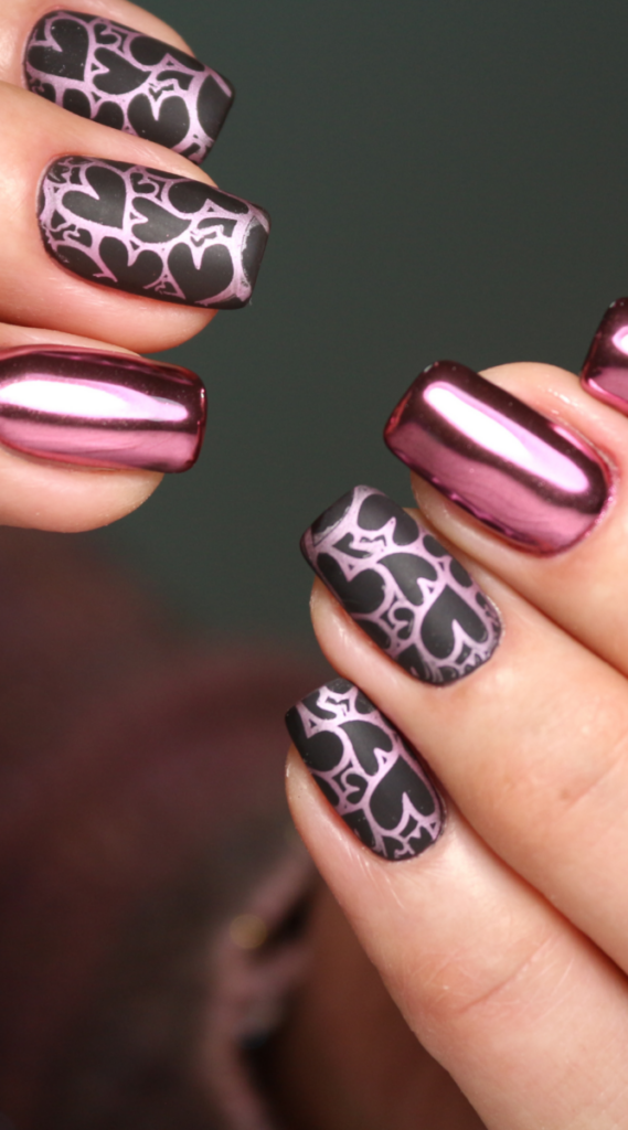 A pink chrome finish paired with matte black and metallic heart patterns makes these nails chic and bold. The design blends romance with an edgy twist, perfect for date nights or special occasions. These nails are a true statement of modern femininity.