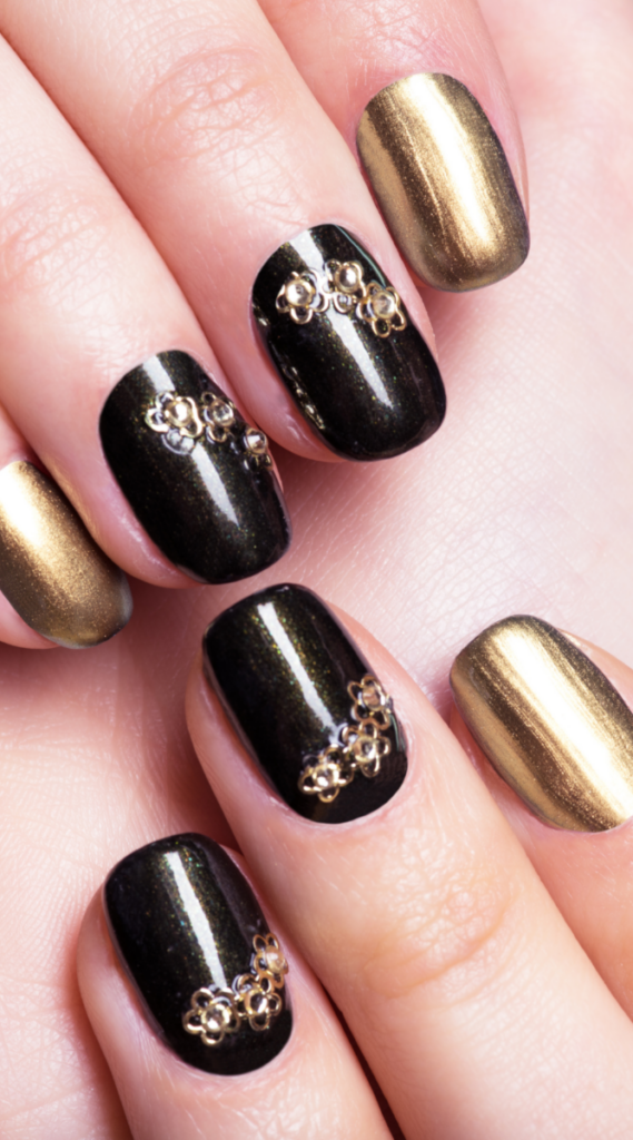 This design combines glossy black polish with golden floral embellishments for a regal touch. The metallic accents create a glamorous look, ideal for formal events or adding elegance to everyday style. It’s a perfect mix of boldness and charm.