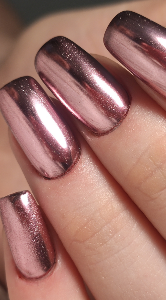 These mirror-finish rosé gold nails are sleek and luxurious. Perfect for any occasion, the high-shine metallic effect adds effortless sophistication. They’re a versatile look for both casual and dressy moments.