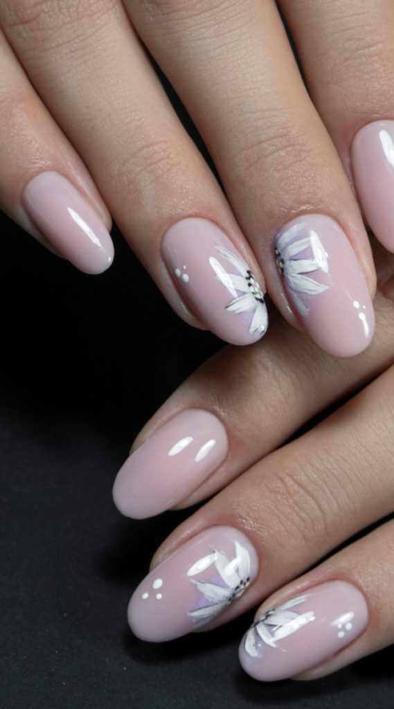 Soft pastel pink nails with hand-painted daisy flowers bring a romantic, fresh vibe. This delicate design is great for weddings, showers, or a simple feminine look. The subtle floral accents add a timeless charm.