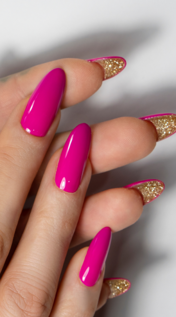 This bright pink polish is paired with a surprise touch of gold glitter on the underside of the nails for a fun twist. It’s a casual but creative look that’s great if you want something different without going overboard. These nails are perfect for hanging out with friends or running errands while still feeling stylish.