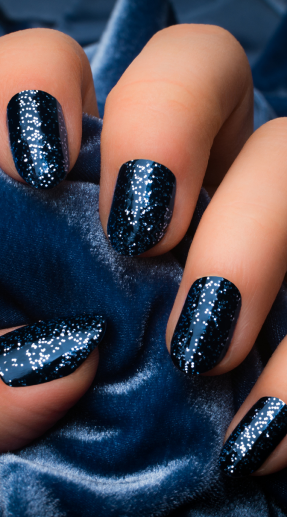 These deep navy nails are covered in tiny silver glitter flecks that look like a starry night sky. They’re simple enough for an everyday vibe but have a festive touch that works for New Year’s Eve too. Pair them with cozy outfits or a casual dinner look—they’re low-key but still special.