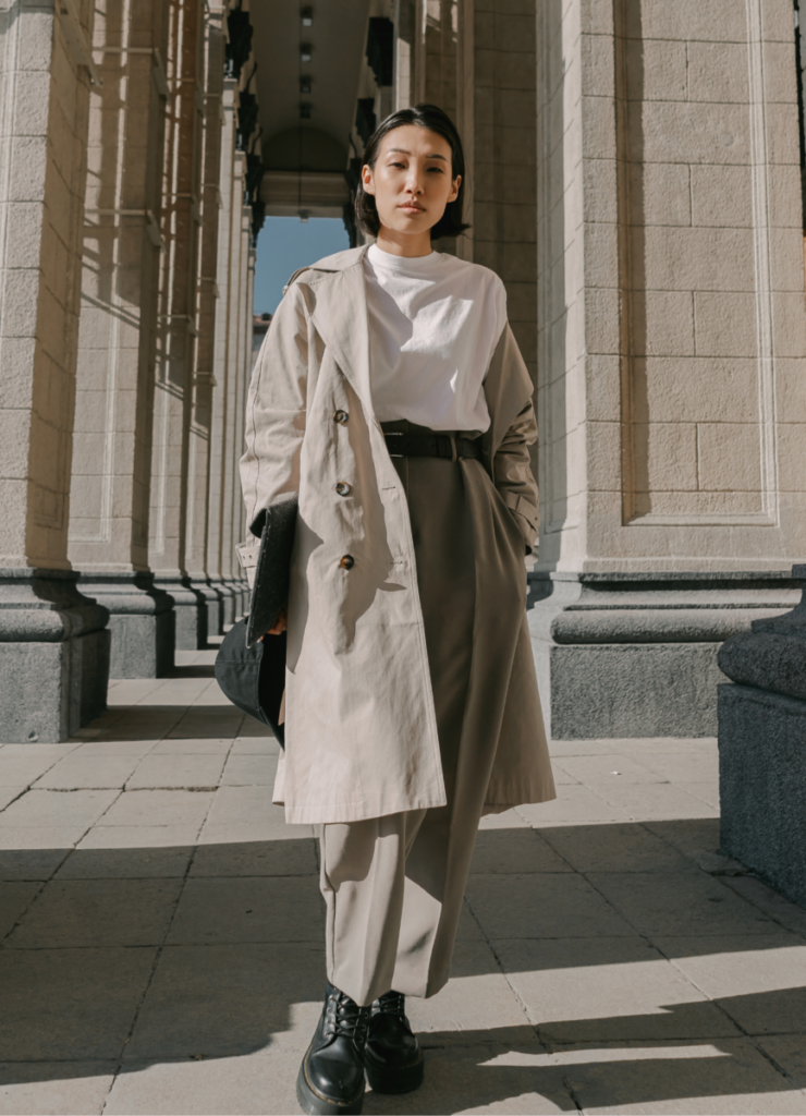 This is the definition of quiet luxury, an oversized trench coat, a crisp white top, and wide-leg trousers that flow with every step. The structured belt adds just the right amount of refinement, while the leather boots keep things practical.