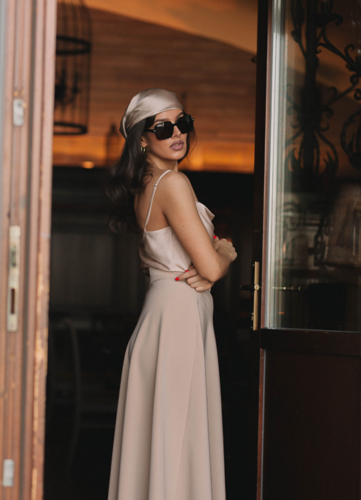 There’s something so effortlessly chic about a silky slip top and a flowing midi skirt. The monochrome look, the delicate straps, and the satin headscarf make this feel straight out of a Parisian café.