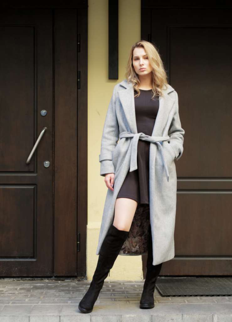 This belted wool coat over a sleek black dress is peak winter elegance. The high boots give it a polished feel while keeping things warm. It’s the kind of look that makes you want to stroll through the city on a cold day.