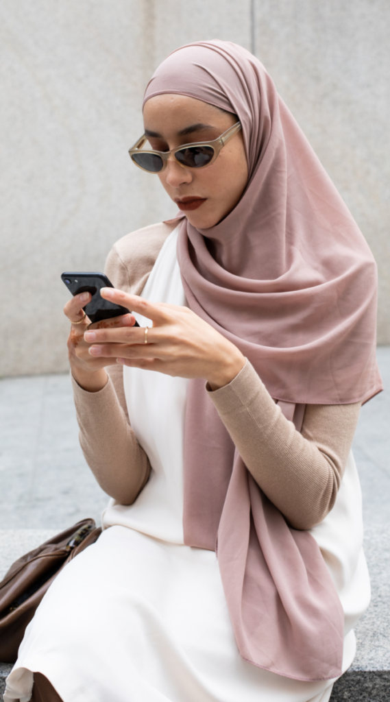 This look combines a soft, blush pink hijab with a cream-colored dress and a beige cardigan. The flowing layers create a graceful and modern aesthetic. The outfit is accessorized with stylish cat-eye sunglasses and a simple brown handbag, perfect for a chic yet comfortable style.