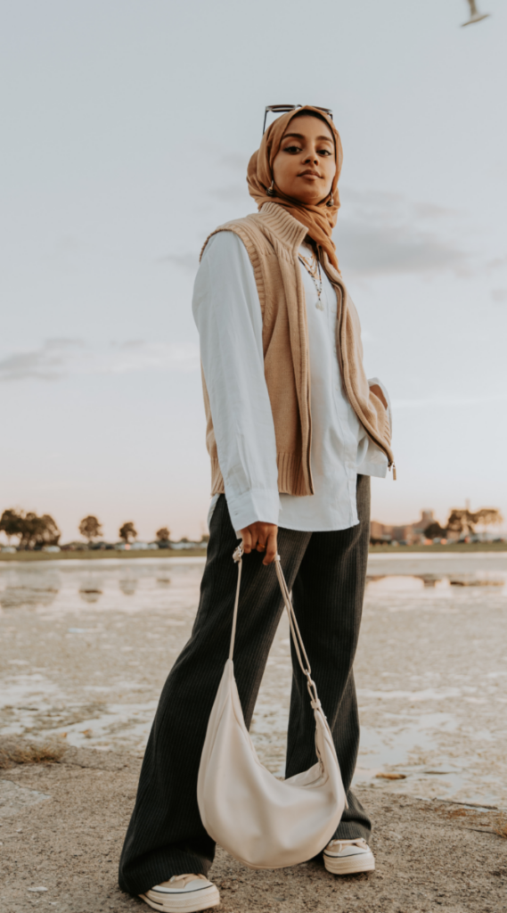 This chic and cozy outfit consists of a white oversized button-down shirt layered with a beige knit vest. The top is paired with black, wide-leg ribbed pants for added comfort. The beige hijab and matching bag complete the look, along with white sneakers for a casual touch.