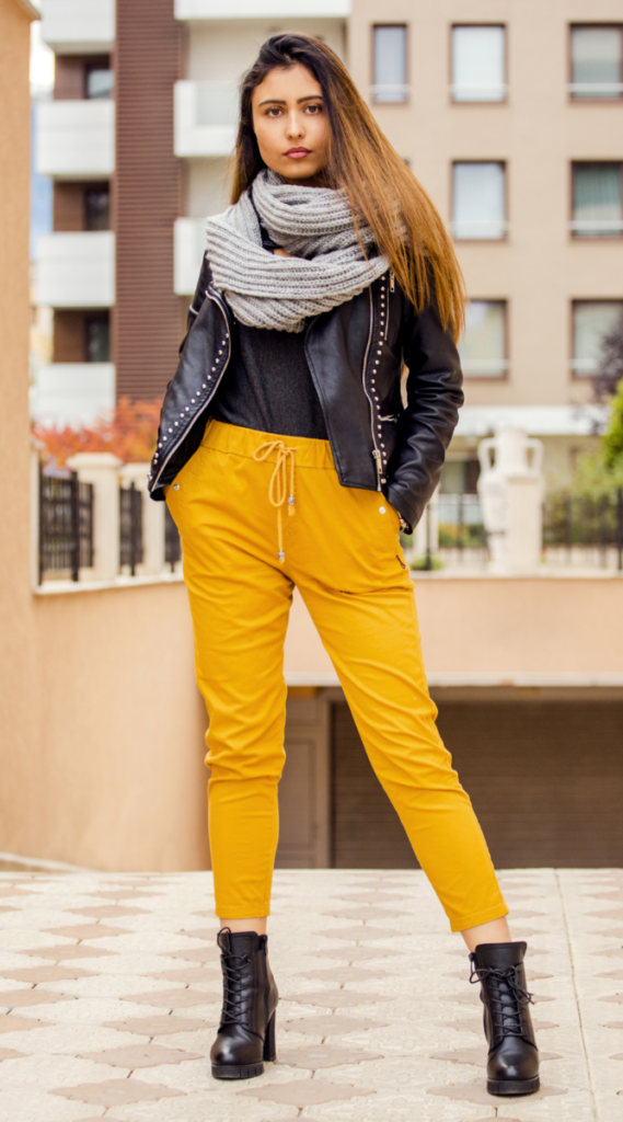 This look features mustard yellow joggers paired with a black leather jacket adorned with studs. The outfit is styled with a chunky grey scarf for warmth and black lace-up boots for an edgy finish. The combination of bold colors and textures makes this a standout look for cooler days.