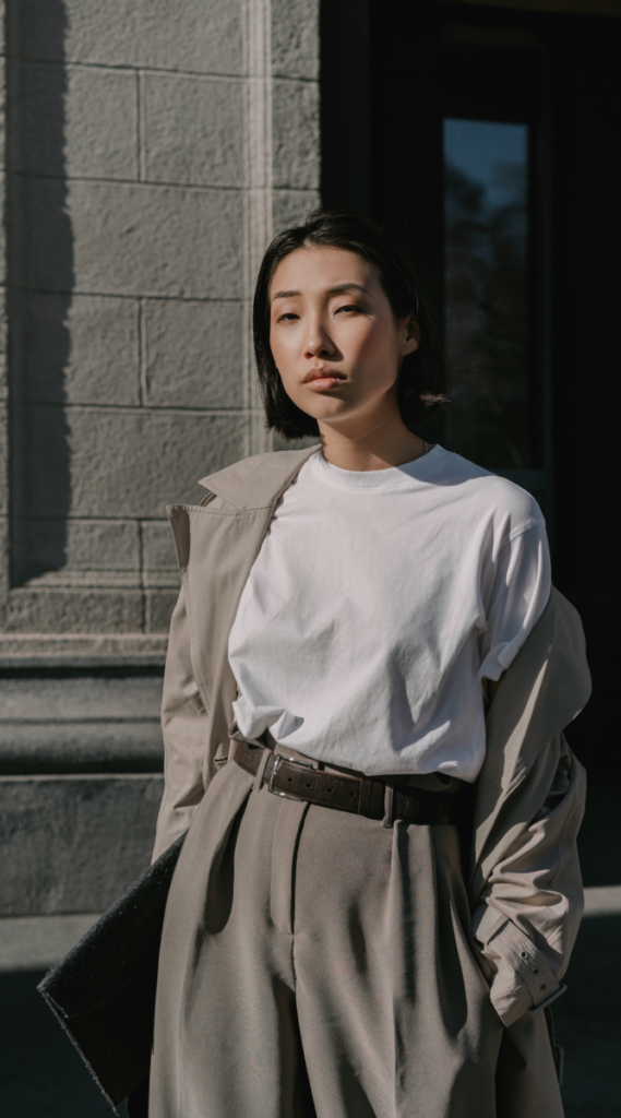 This minimalist outfit pairs a classic white t-shirt with high-waisted beige trousers. The trousers are cinched with a dark brown belt, adding structure to the look. A light trench coat draped over the shoulders and the neutral palette give a sophisticated yet effortless feel.