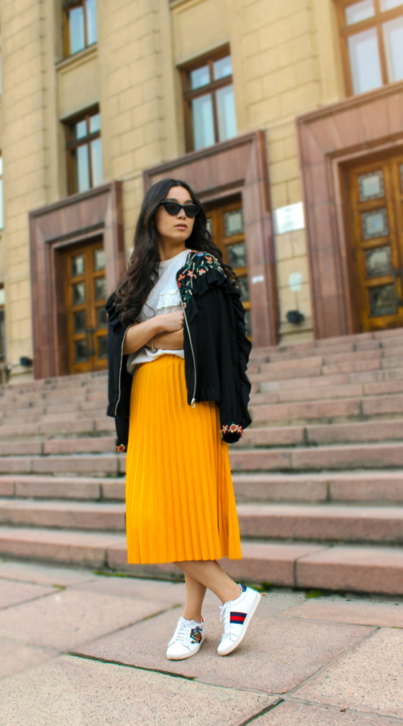 This stylish ensemble includes a bright yellow pleated midi skirt paired with a white top and a black embroidered jacket. The skirt adds a vibrant pop of color, while the white sneakers keep it comfortable and casual. Sunglasses complete the chic and effortless look.