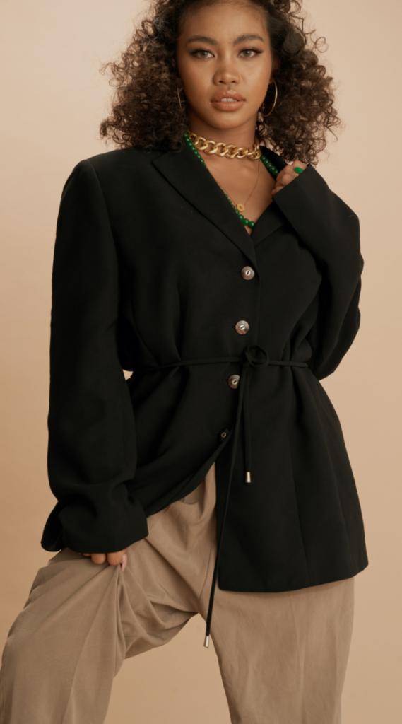 This look combines a tailored black blazer with beige, relaxed-fit trousers for a sophisticated yet casual vibe. The blazer, cinched at the waist with a thin tie belt, creates a flattering silhouette. Gold jewelry, including a chunky chain necklace and hoop earrings, adds a touch of glam.