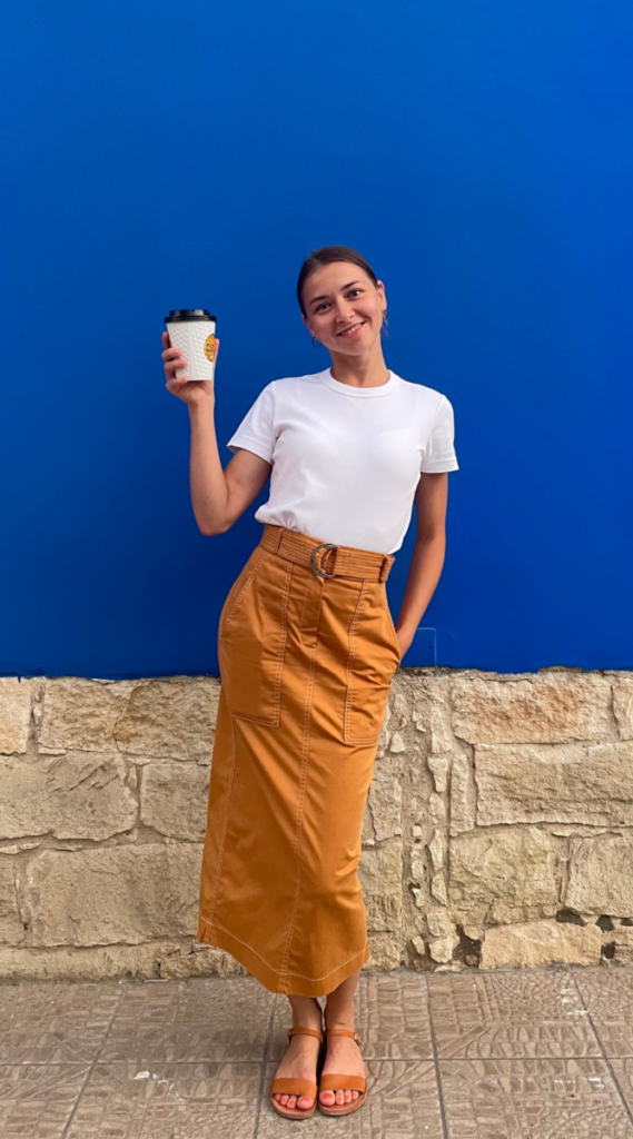 This autumn-inspired look includes a tan midi skirt with a high waist and a white t-shirt. The skirt features a belt that adds structure, while the white t-shirt keeps it simple and comfortable. The outfit is completed with tan sandals, perfect for a warm autumn day.
