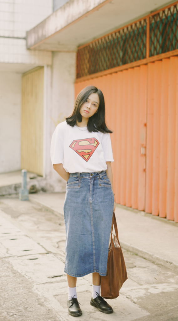 This casual outfit features a white oversized t-shirt with a Superman logo, paired with a high-waisted denim midi skirt. The look is completed with black oxford shoes, white socks, and a brown tote bag, giving it a playful and relaxed vibe.