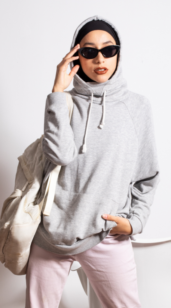 A grey hoodie with a cozy, oversized fit is paired with light pink pants, creating a comfortable and stylish outfit for a casual day. The look is accessorized with black cat-eye sunglasses and a large, cream-colored backpack. The neutral tones keep the look fresh and modern.