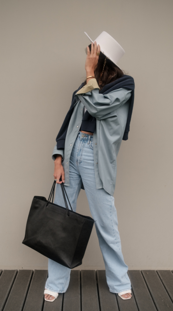 This layered outfit features a light blue oversized shirt worn over a navy sweatshirt, paired with light-wash, wide-leg jeans. A white wide-brimmed hat and a large black tote bag add an element of sophistication to the casual look. The ensemble is finished with white braided sandals.