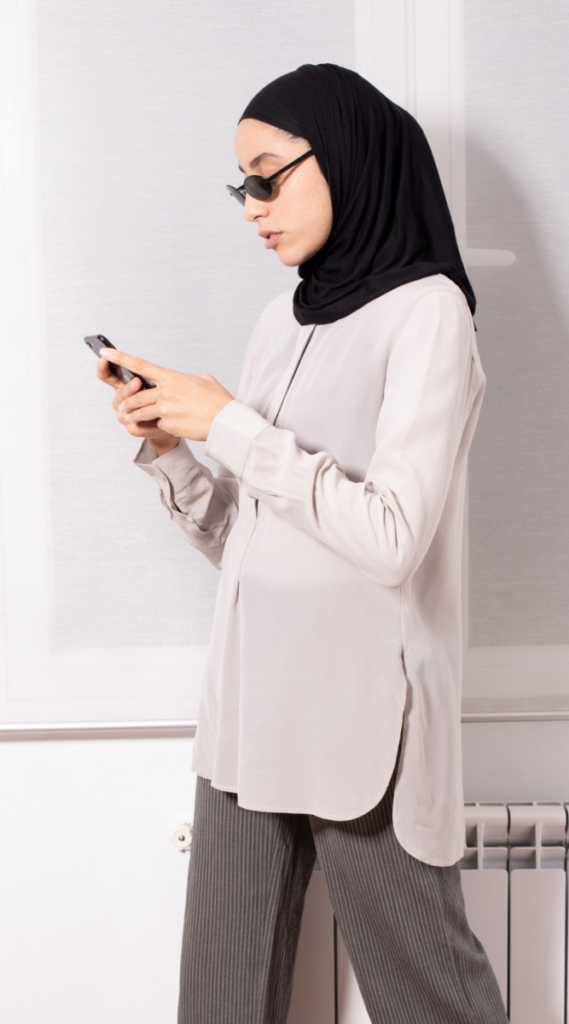 This minimalist look includes a long, light grey tunic-style shirt paired with dark grey, pinstriped trousers. The outfit is accessorized with black, slim sunglasses and a black hijab, giving it a sleek and modern touch. The simplicity of the pieces makes this outfit effortlessly stylish.