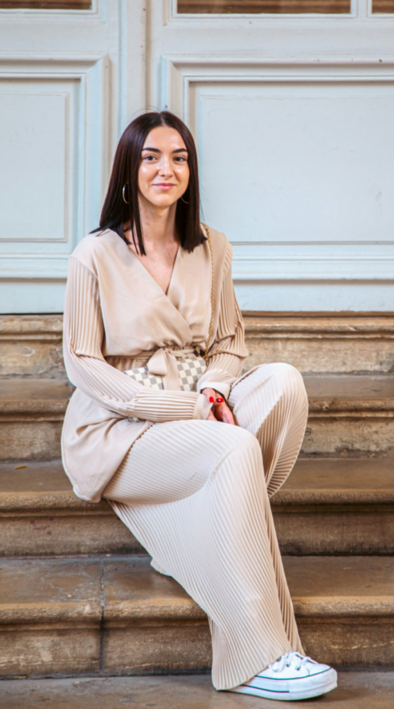 This look features a beige, pleated set with a wrap top and wide-leg pants. The wrap top accentuates the waist, while the pleats add texture and movement. The outfit is completed with white sneakers for a touch of casual comfort, and large hoop earrings add a bit of sparkle.
