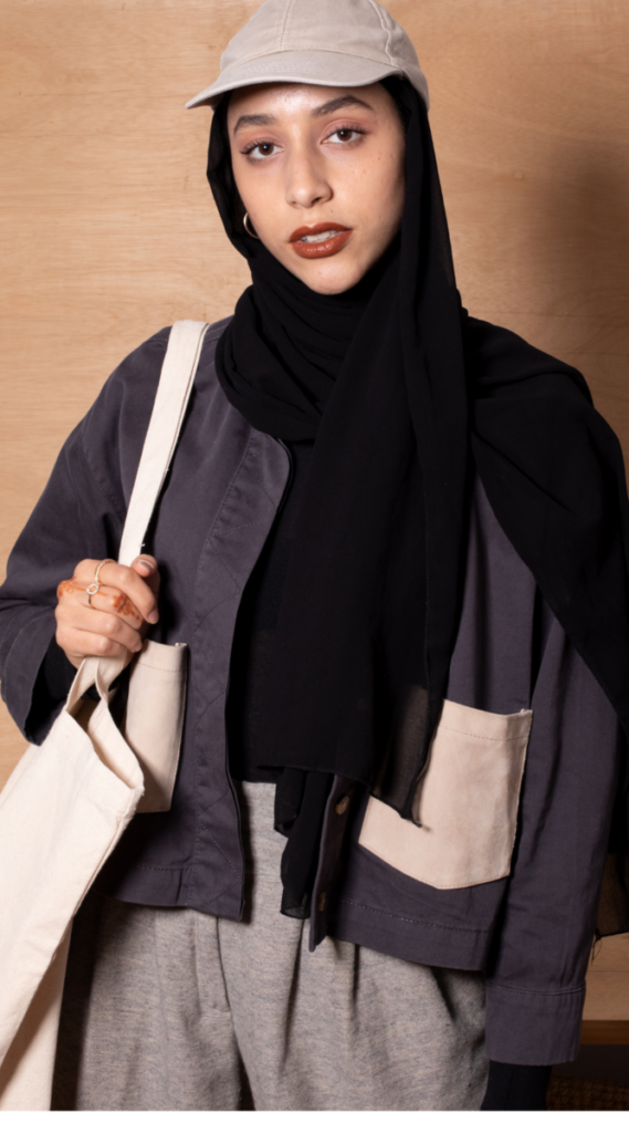 This casual street style features a black hijab and a grey and beige color-blocked jacket with oversized front pockets. The look is completed with grey loose-fit pants and a beige cap, adding a relaxed and sporty touch. A cream tote bag and minimal jewelry finish off this laid-back yet stylish outfit.