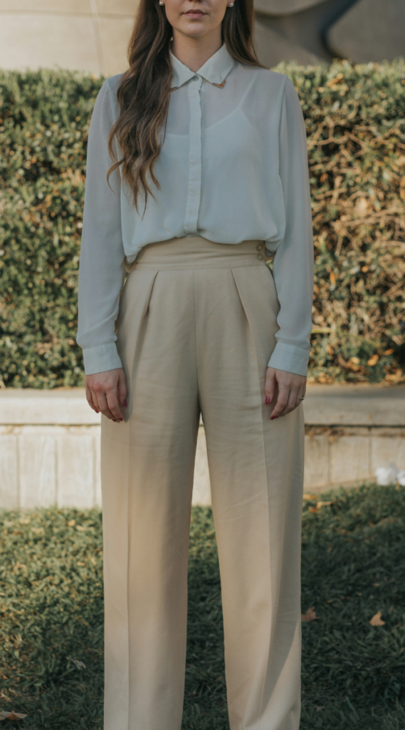 This professional outfit includes a sheer white blouse with a delicate collar detail, paired with high-waisted beige trousers. The blouse is tucked in neatly, creating a polished look. Simple pearl earrings and soft waves in the hair add a touch of elegance.