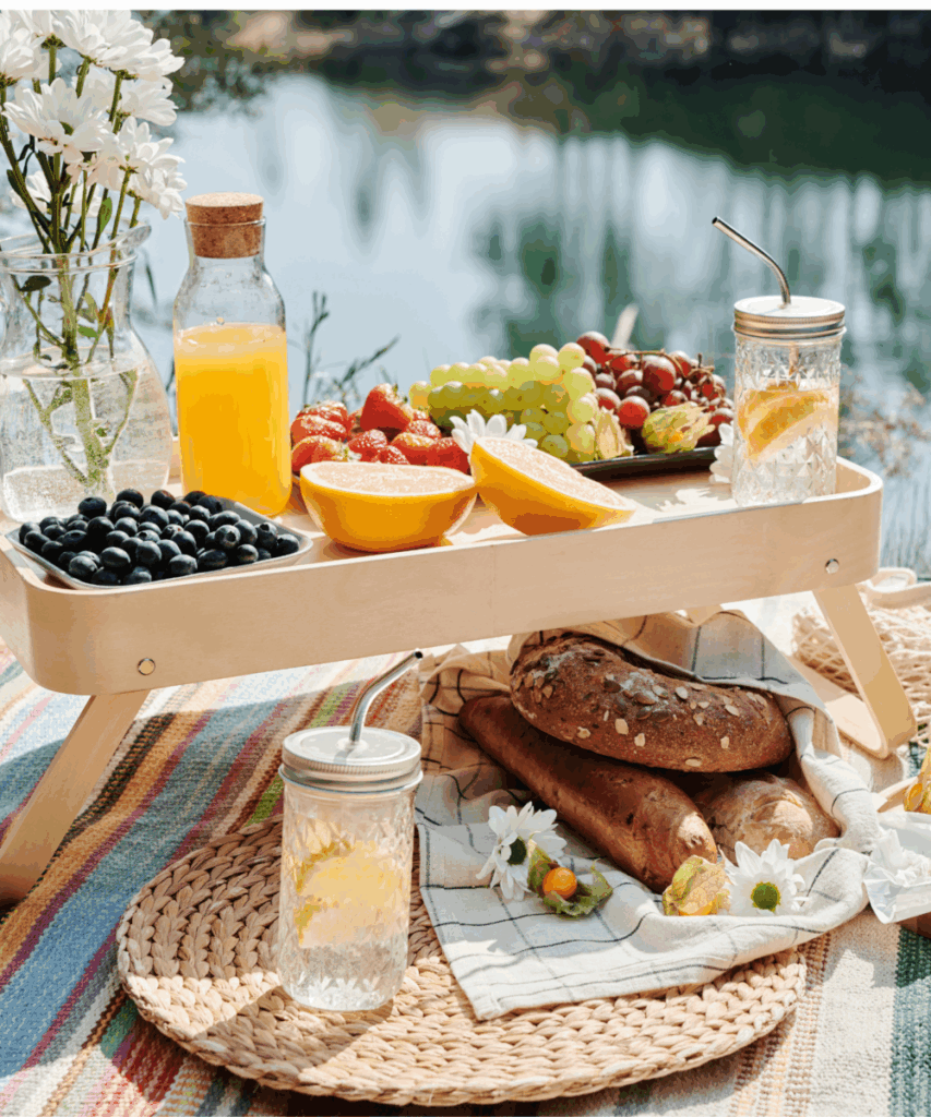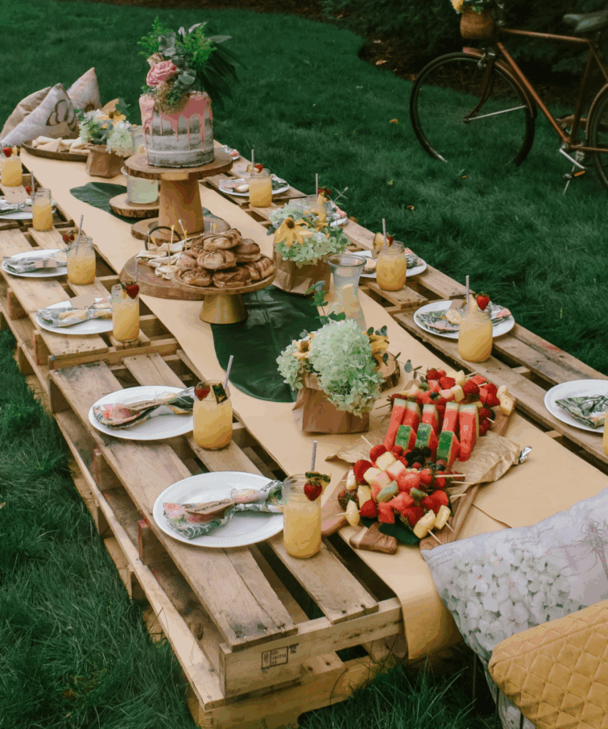 To bring this kind of picnic to life, play around with colors and textures. Think citrus fruits, fun spreads, and breads with personality. I’d add a little flower arrangement or faux blooms to brighten things up and use a wooden serving board to make everything look extra inviting. Super cute and totally doable!