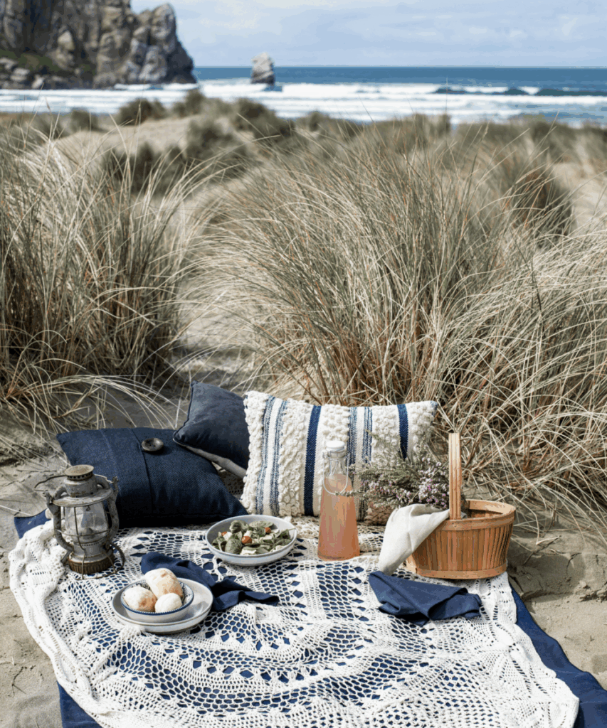 If you’re heading to the beach, pack light but pretty. A lace or crochet blanket photographs beautifully and doesn’t trap heat. Stick to simple bites like rolls, salad, or fruit, and bring soft pillows or a candle lantern to make it feel more like a mini outdoor retreat.