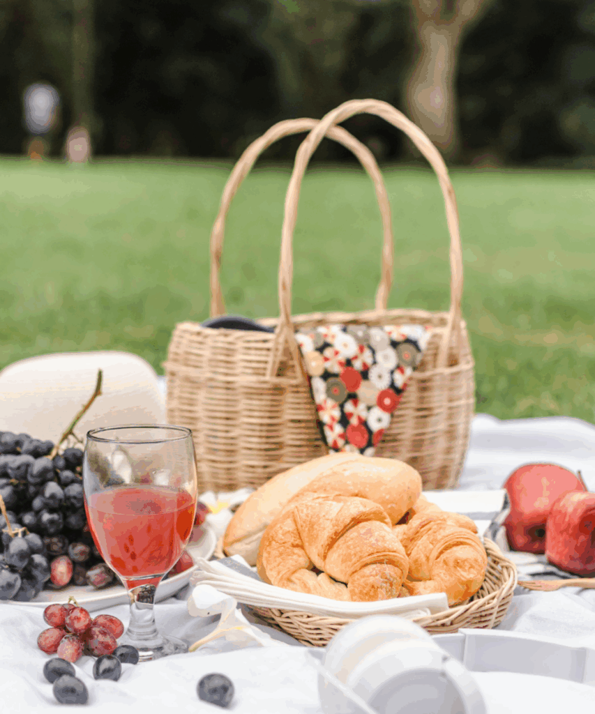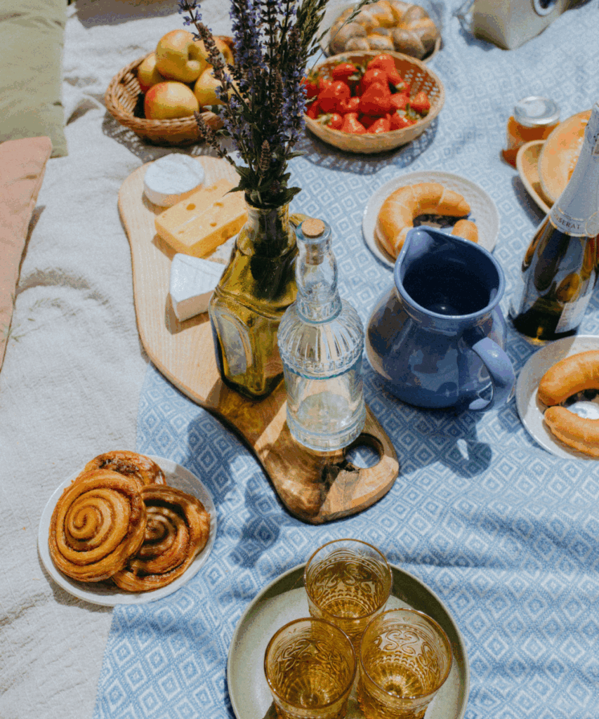 Planning a picnic is way easier than it looks, especially when you go in with a little idea of the vibe you’re going for. Start by picking your spot (somewhere shady and quiet is always a win) and bring a blanket or sheet you don’t mind spreading out. Then layer in some extras: throw pillows, a tray or small table, candles or flowers if you’re feeling fancy.